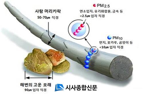¹Ì¼¼¸ÕÁö´Â ´ë±â Áß¿¡ ¶°´Ù´Ï´Â 10§ ÀÌÇÏÀÇ ÀÔÀÚ»ó ¹°ÁúÀ» ¸»ÇÑ´Ù. »ç¶÷ÀÇ ¸Ó¸®Ä«¶ô Á÷°æÀÌ 60§ Á¤µµÀÓÀ» °¨¾ÈÇϸé À̺¸´Ù 6¹è ³Ñ°Ô ¹Ì¼¼ÇÑ ¹°ÁúÀÓÀ» ¾Ë ¼ö ÀÖ´Ù. ¹Ì¼¼¸ÕÁö´Â ¶Ç Å©±â¿¡ µû¶ó PM10(10§ ÀÌÇÏ)°ú PM2.5(2.5§ ÀÌÇÏ)·Î ±¸ºÐµÈ´Ù. ¹Ì¼¼¸ÕÁö ³óµµ°¡ ÀÏÁ¤¼öÁØ(PM10 81§¶/§© ¶Ç´Â PM2.5 51§¶/§© ÀÌ»ó)À» ³Ñ¾î¼¸é ¿¹º¸µî±ÞÀÌ ¡®³ª»Ý¡¯ÀÌ µÇ°í, ÀÌ ¼öÁØÀ» ³Ñ¾î¼± ³óµµ°¡ ÀÏÁ¤½Ã°£ Áö¼ÓµÉ °æ¿ì ¡®ÁÖÀǺ¸¡¯¿Í ¡®°æº¸¡¯°¡ ¹ß·ÉµÈ´Ù.