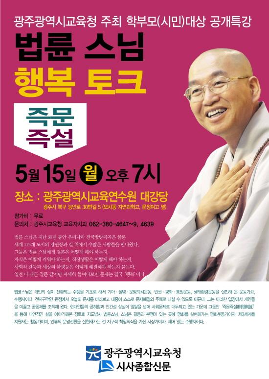 ¡®Çູ ÅäÅ©¡¯¸¦ ÁÖÁ¦·Î ÇÑ À̹ø °ø°³ °ÀÇ´Â 15ÀÏ ¿ÀÈÄ7½Ã ±¤ÁÖ±¤¿ª½Ã±³À°¿¬¼ö¿ø(ºÏ±¸ ¿ÀÄ¡µ¿ ¼ÒÀç)¿¡¼ ¸·À» ¿Ã¸°´Ù. ¹ý·û½º´ÔÀº ´Ü¼øÇÏÁö¸¸ µû¶æÇÏ°í ¸íÄèÇÑ¡®Çູ·Ð¡¯À» ÅëÇØ ÇູÀÇ ±æÀ» ¸ô¶ó Çì¸Å´Â À̵鿡°Ô º¸ÅÆÀÌ µÇ´Â ¼ÒÁßÇÑ ½Ã°£À» ¼±»çÇÒ ¿¹Á¤ÀÌ´Ù.