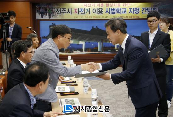 ÀüÁֽô 25ÀÏ ½Ãû ´ëȸÀǽǿ¡¼ ±è½Â¼ö ÀüÁÖ½ÃÀå°ú ÀüÁÖ½ÅÈïÁßÇб³ µî ÀÚÀü°Å ½Ã¹üÇб³·Î ÁöÁ¤µÈ 13°³ ÁßÇб³¿Í 10°³ °íµîÇб³ µî 23°³ Çб³ °ü°èÀÚ 40¿©¸íÀÌ Âü¼®ÇÑ °¡¿îµ¥, ÀÚÀü°Å ½Ã¹üÇб³ ÁöÁ¤½ÄÀ» °¡Á³´Ù. ÀüÁֽô À̳¯ °¢ Çб³ °ü°èÀڵ鿡°Ô ÀÚÀü°Å ½Ã¹üÇб³ ÁöÁ¤¼¸¦ ±³ºÎÇϰí, ÇлýµéÀÇ ÀÚÀü°Å ÀÌ¿ëȰ¼ºÈ¸¦ À§ÇÑ °£´ãȸµµ °¡Á³´Ù.