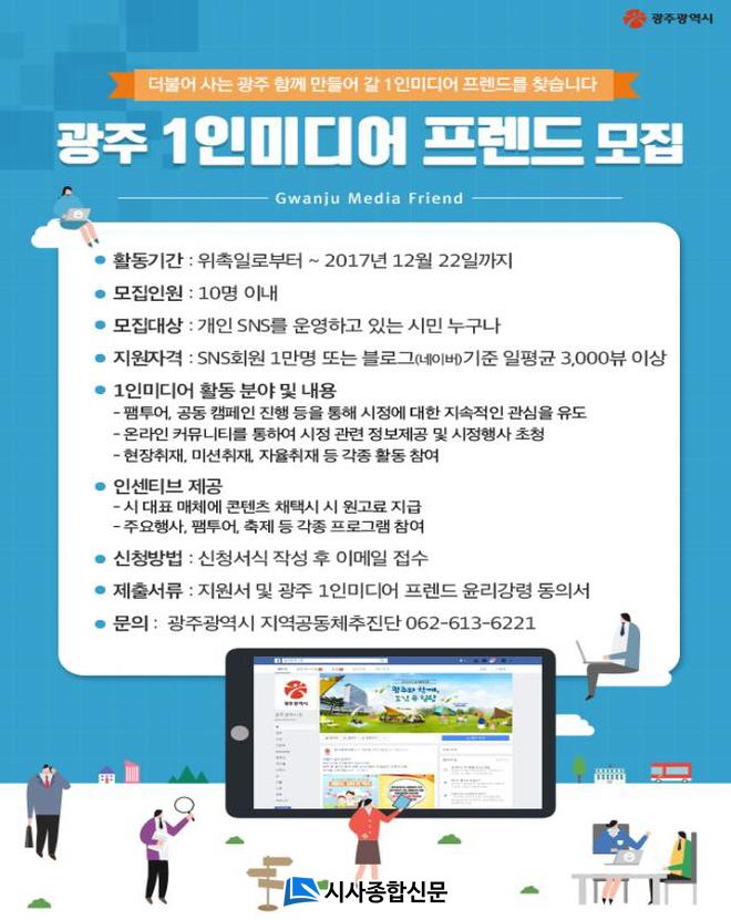 ±¤ÁÖ±¤¿ª½Ã´Â ¼Ò¼È¹Ìµð¾î ¿î¿µÀÚÀÇ Âü¿©¿Í ´Ù¾çÇÑ ÄÜÅÙÃ÷ È®º¸¸¦ À§ÇØ ¡®±¤ÁÖ1Àι̵ð¾î ÇÁ·»µå¡¯¸¦ ¿À´Â 7ÀϺÎÅÍ 18ÀϱîÁö ¸ðÁýÇÑ´Ù. 1ÀÎ ¹Ìµð¾î´Â °³ÀÎ ºí·Î±×³ª SNS µîÀ» ±â¹ÝÀ¸·Î ÇØ °³ÀÎÀÌ ´Ù¾çÇÑ ÄÜÅÙÃ÷¸¦ »ý»êÇÏ°í °øÀ¯ÇÏ´Â ÀÇ»ç¼ÒÅë ±¸Á¶´Ù.