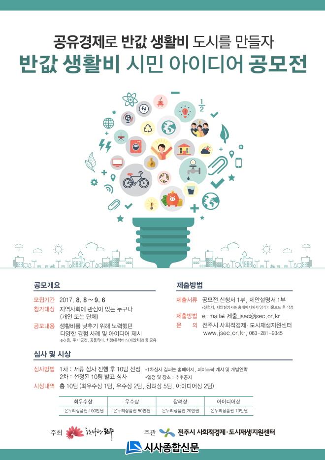 ¸ÕÀú, ÀüÁÖ½Ã¿Í ÀüÁֽûçȸÀû°æÁ¦Áö¿ø¼¾ÅÍ´Â ¿À´Â 9¿ù 6ÀϱîÁö °øÀ¯°æÁ¦¸¦ ÅëÇØ ¹Ý°ª »ýȰºñ µµ½Ã¸¦ ¸¸µé±â À§ÇØ ½Ã¹Î¾ÆÀ̵ð¾î¸¦ ¸ðÁýÇÑ´Ù. °øÀ¯°æÁ¦¿¡ °ü½É Àְųª, °ú°Å ¸Ô°Å¸®¿Í ÀÔÀ» °Å¸®, ±³Å롤Åë½Å, ÁÖÂ÷Àå, °øµ¿À°¾Æ, ÁְŰø°£ µîÀ» °øÀ¯ÇÏ´Â µî »ýȰºñ¸¦ ³·Ãß±â À§ÇØ ³ë·ÂÇß´ø °æÇèÀÌ ÀÖ´Â ½Ã¹ÎµéÀº À̹ø ±âȸ¸¦ ÅëÇØ ¾ÆÀ̵ð¾î¸¦ »ç¾÷À¸·Î ¹ßÀü½Ãų ¼ö ÀÖ´Â ¹ßÆÇÀ» ¸¶·ÃÇÒ ¼ö ÀÖ´Ù.