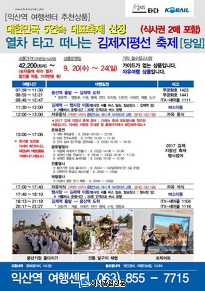 À̹ø ¿©Çà»óǰÀº ÃàÁ¦±â°£¿¡ ÇѽÃÀûÀ¸·Î ¿îÇàµÇ¸ç, ¿ë»ê¿ªÀ» Ãâ¹ßÇÏ¿© ¿µµîÆ÷, ¼ö¿ø, ÆòÅÃ, õ¾È, Á¶Ä¡¿ø, ½ÅźÁø, ¼´ëÀü, °è·æ, ³í»ê¿¡ Á¤Â÷Çϸç ÇÏ·ç¿¡ ¿Â÷ 3´ë°¡ ¿îÇàµÈ´Ù. ±èÁ¦¿ª µµÂø ÈÄ¿¡´Â Çà»çÀå ¼ÅÆ²¹ö½º¸¦ ÅëÇØ ÃàÁ¦Àå¿¡ µµÂøÇÏ¿© 5°³ ºÐ¾ß 55°³ ÇÁ·Î±×·¥À¸·Î ±¸¼ºµÈ ÁöÆò¼±ÃàÁ¦ Çà»ç Âü¿© ÈÄ ±èÁ¦¿ªÀ» Ãâ¹ßÇÏ¿© ¿ë»ê¿ª¿¡ µµÂøÇÏ´Â ÀÏÁ¤ÀÌ´Ù.