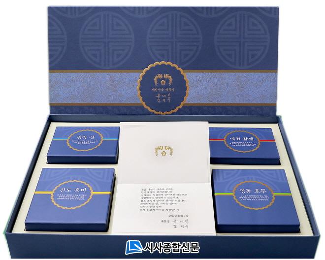 û¿Í´ë Ãß¼® ¼±¹°¼¼Æ®´Â Áö¿ªÀÇ ´ëÇ¥ Ư»ê¹°·Î ÁøµµÈæ¹Ì¸¦ ºñ·ÔÇØ Æòâ Àã, ÀÌõ ÇݽÒ, ¿¹Ãµ Âü±ú, ¿µµ¿ ÇÇÈ£µÎ µî ´Ù¼¸Á¾ÀÌ ´ã°å´Ù. À̹ø ¼±¹°¼¼Æ®´Â ÀüÁ÷ ´ëÅë·É°ú 5ºÎ¿äÀÎ, Á¤°è ¿ø·Î¿Í Â÷°ü±Þ ÀÌ»ó Á¤ºÎ °íÀ§°øÁ÷ÀÚ, Á¾±³¡¤¹®È°è Àλç, »çȸ ¼Ò¿Ü°èÃþ µî 7,000¿©¸í¿¡°Ô ¹è¼ÛµÈ´Ù.