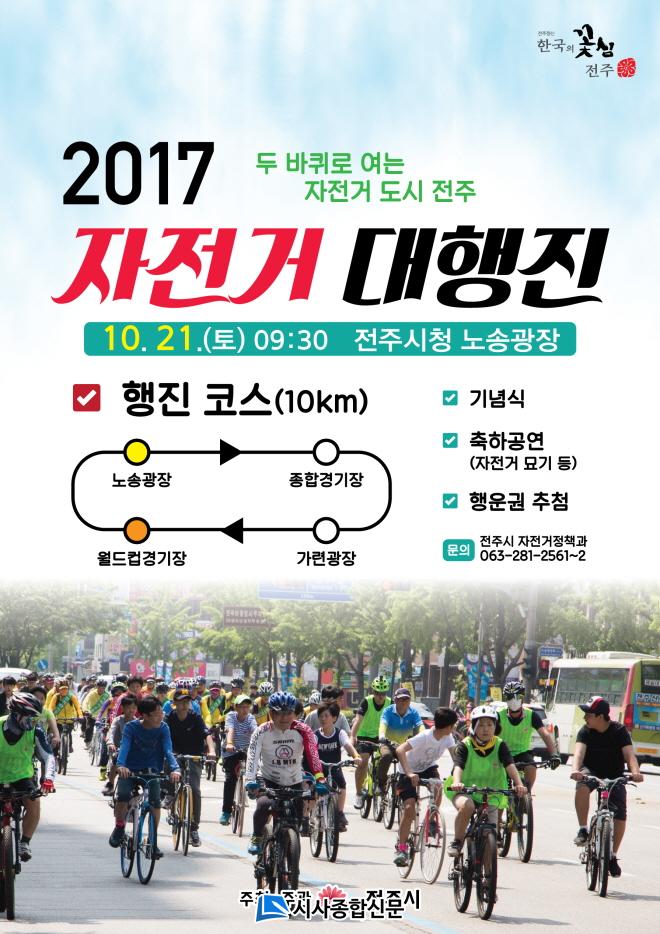 ÀüÁֽô ¿À´Â 10¿ù 21ÀÏ ÀÚÀü°Å µµ½Ã·ÎÀÇ µµ¾àÀ» À§ÇÑ ¡®2017 ÀüÁֽùΠÀÚÀü°Å ´ëÇàÁø¡¯Çà»ç¸¦ °³ÃÖÇϰí, Âü¿©ÇÑ ½Ã¹Îµé°ú ÇÔ²² ÀüÁÖ½Ãû¿¡¼ Ãâ¹ßÇØ ÀüÁÖ¿ùµåÄŰæ±âÀå±îÁö ±â¸°´ë·Î 10km ±¸°£À» ÇÔ²² ´Þ¸®´Â ÀÚÀü°Å ´ëÇàÁøÀ» ÁøÇàÇÑ´Ù°í 13ÀÏ ¹àÇû´Ù. Çлý°ú Á÷ÀåÀÎ, µ¿È£È¸¿ø, ±â°ü¡¤´Üü µî °¢°è°¢ÃþÀÇ ½Ã¹ÎÀÌ ÇÔ²² Âü¿©ÇÏ°Ô µÉ À̹ø ÀÚÀü°Å ´ëÇàÁøÀº Áö¼Ó°¡´ÉÇÑ µµ½Ã¹ßÀüÀ» À§ÇØ »ýű³Åë¼ö´ÜÀÎ ÀÚÀü°ÅÀÇ ÀÌ¿ëÀ» È®»ê½Ã۱â À§ÇØ ¸¶·ÃµÈ Çà»ç´Ù.