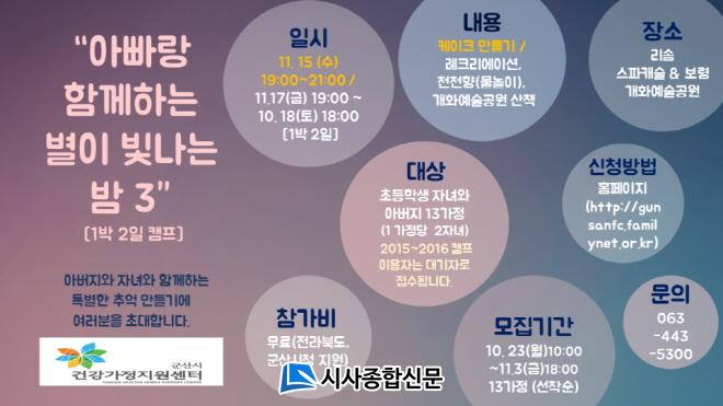 Âü°¡ºñ ¹«·á·Î ÁøÇàµÇ´Â À̹ø ÇÁ·Î±×·¥Àº ¾Æ¹öÁö¿Í 8~13¼¼ ÀÚ³à·Î ±¸¼ºµÈ °¡Á·(3ÀÎ)À» ´ë»óÀ¸·Î ¸ðÁýÇϸç Âü°¡¸¦ Èñ¸ÁÇÏ´Â °¡Á·Àº 11¿ù 3ÀϱîÁö ±º»ê½Ã°Ç°°¡Á¤Áö¿ø¼¾ÅÍ È¨ÆäÀÌÁö(gunsanfc.familynet.or.kr)¸¦ ÅëÇØ ½Åû(¼±Âø¼ø ¸¶°¨, ºÎÀÚ°ü°èÇâ»ó Ä·ÇÁ ¹Ì Âü¿© °¡Á¤ ¿ì¼± ¼±¹ß)ÇÏ¸é µÇ¸ç ±âŸ ÀÚ¼¼ÇÑ »çÇ×Àº ±º»ê½Ã°Ç°°¡Á¤Áö¿ø¼¾ÅÍ(¢Ï 443-5300)·Î ¹®ÀÇÇÏ¸é µÈ´Ù.