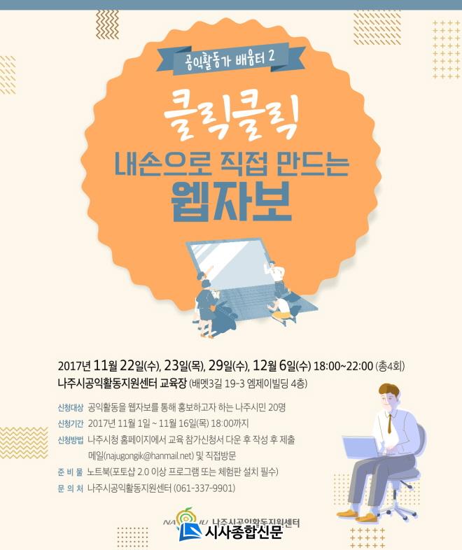 ³ªÁֽô ¿À´Â11¿ù 22ÀϺÎÅÍ 12¿ù 6ÀϱîÁö ÃÑ 4Â÷·Ê(19~22½Ã)¿¡ °ÉÃÄ ½Ç½ÃµÇ´Â À̹ø ±³À°Àº °øÀÍȰµ¿ È«º¸ µî¿¡ À¯¿ëÇÑ À¥ÀÚº¸ Á¦ÀÛ¿¡ Çʼö Ç׸ñÀÎ Æ÷Åä¼¥ ±â¹ý ±³À°À» ½Ç½ÃÇÒ °èȹÀÌ´Ù.
