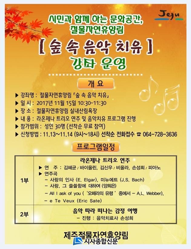 À̹ø °Á´ 15ÀÏ ¿ÀÀü 10½Ã 30ºÐ ~ 11½Ã 30ºÐ µ¿¾È Àý¹°ÀÚ¿¬È޾縲 ½Ç³»»ê¸²¿åÀå³»¿¡¼ 1½Ã°£°¡·® ÁøÇàµÇ¸ç Àü¹® À½¾ÇÄ¡·á»ç¸¦ ÃʺùÇÏ¿© ¡®À½¾Ç µû¶ó ¶°³ª´Â °¨Á¤¿©Ç࡯À̶ó´Â ÁÖÁ¦·Î ÁøÇàµÈ´Ù. Á¦ 1ºÎ¿¡¼´Â °¡À»¿¡ ¾î¿ï¸®´Â »ç¶ûÀÇ Àλç(E,Elgar), ¿ÀÆä¶óÀÇ À¯·É, ¹Ì´º¿¡Æ®(J.S.Bach) µî ´Ù¾çÇÑ ¿¬ÁÖ°îÀÌ ¹ÙÀ̿ø°, ºñ¿Ã¶ó, ÇÇ¾Æ³ë »ïÁßÁÖ·Î ¿¬ÁֵȴÙ. Á¦ 2ºÎ¿¡¼´Â ½£°ú À½¾ÇÀÌ ¸¸³µÀ» ¶§ ´À³¢´Â ´Ù¾çÇÑ °¨Á¤ÀÇ º¯È¸¦ Àü¹®À½¾ÇÄ¡·á»ç¿Í ÇÔ²² À̾߱⠳ª´²º½À¸·Î½á Âü°¡ÀÚµéÀÌ Á÷Á¢ÀûÀÎ À½¾ÇÄ¡À¯ÀÇ °æÇèÀ» ÇØ º¼ ¼ö ÀÖ´Â ±âȸ°¡ ¸¶·ÃµÈ´Ù.