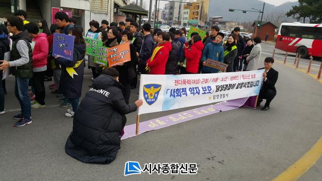 12¿ù 7ÀÏ ¿ÀÀü 11½ÃºÎÅÍ ÇÑ ½Ã°£ µ¿¾È ´ã¾çÀ¾ ÀÏ¿øÀ» µ¹¸ç Áö¿ª»çȸ Áß½ÉÀ¸·Î ¿©¼º°ú ¾Æµ¿, û¼Ò³â ¹× Àå¾ÖÀÎµî »çȸÀû ¾àÀÚ¸¦ º¸È£Çϱâ À§ÇÑ ¾ÈÀü¸Á ±¸ÃàÀÇ ÀÏȯÀ¸·Î ´ã¾çÀαÇÁö¿ø»ó´ã¼Ò¸¦ ºñ·ÔÇÏ¿© ´ã¾ç±ºÃ», Àü³²µµ¸³´ë °æÂûÇàÁ¤Çаú Çлý, ´Ù¹®È¼¾ÅÍ µî 70¿©¸íÀÌ Âü¼®ÇÑ °¡¿îµ¥ ¼ºÆø·Â ¿¹¹æ Ä·ÆäÀÎÀ» ½Ç½ÃÇÏ¿´´Ù.