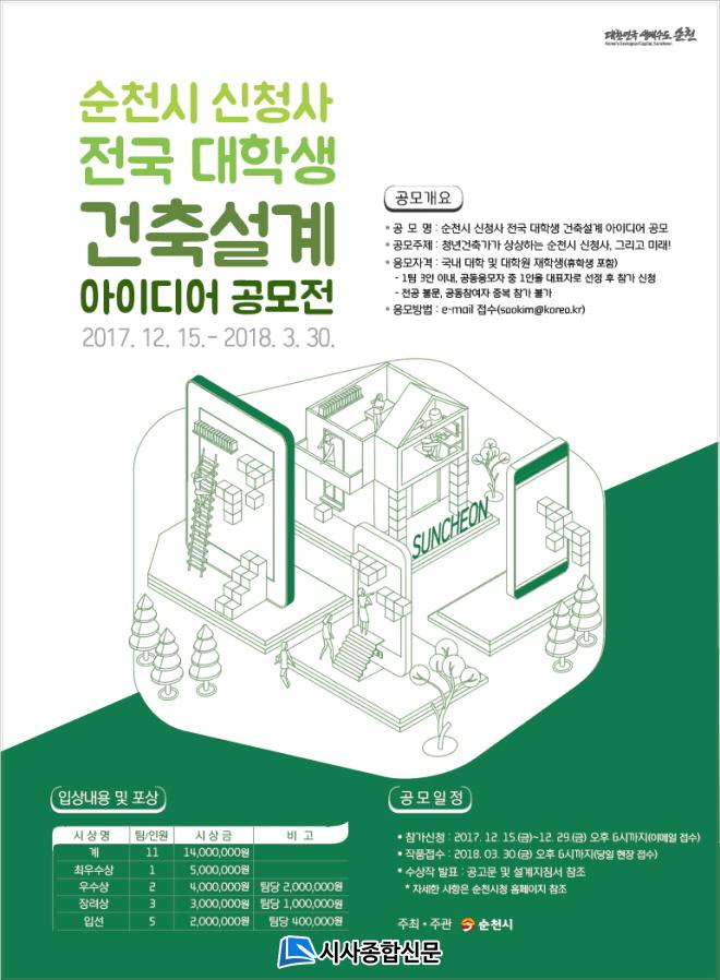 ¼øÃµ½Ã¿¡ µû¸£¸é ¼øÃµ½Ã ½Åû»ç °Ç¸³°ú °ü·ÃÇØ Àü±¹ ´ëÇлýµéÀÇ Âü½ÅÇÑ ¾ÆÀ̵ð¾î ÀÛǰÀ» ¹ß±¼ Àü½ÃÇÏ°í ½Ã¹Î °ø°¨´ë Çü¼º ¹× ÇâÈÄ Ã»»ç°Ç¸³ Çö»ó¼³°è °ø¸ð ½Ã Âü°í¹Ý¿µÇϱâ À§ÇØ Áö³ 15ÀϺÎÅÍ ³»³â 3¿ù 30ÀϱîÁö ¡®¼øÃµ½Ã ½Åû»ç, Àü±¹ ´ëÇлý °ÇÃ༳°è ¾ÆÀ̵ð¾î °ø¸ðÀü¡¯À» °³ÃÖÇÑ´Ù.