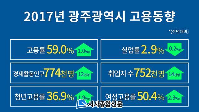 2017³â ±¤Áֽà °í¿ëÁöÇ¥´Â °æÁ¦È°µ¿Âü°¡À²ÀÌ ³ô¾ÆÁ® Ãë¾÷ÀÚ°¡ Àü³â ´ëºñ 1¸¸4000¸í Áõ°¡ÇÑ 75¸¸2000¸íÀ¸·Î 1.8% Áõ°¡ÇÔÀ¸·Î½á °í¿ë·üÀ» 1%p ²ø¾î ¿Ã¸° ¹Ý¸é, ½Ç¾÷ÀÚ´Â 1500¸í °¨¼ÒÇÑ 2¸¸2000¸íÀ¸·Î 6.3% °¨¼ÒÇØ ½Ç¾÷·üÀ» 2.9% ¼öÁرîÁö ³·Ãç ½Ç¾÷·üÀÌ Æ¯‧±¤¿ª½Ã Áß 1À§¸¦ Â÷ÁöÇÏ´Â µî °í¿ëÁöÇ¥°¡ Àü³âµµ¿¡ ºñÇØ Å©°Ô °³¼±µÆ´Ù´Â Á¡¿¡¼ Àǹ̰¡ Å©´Ù.