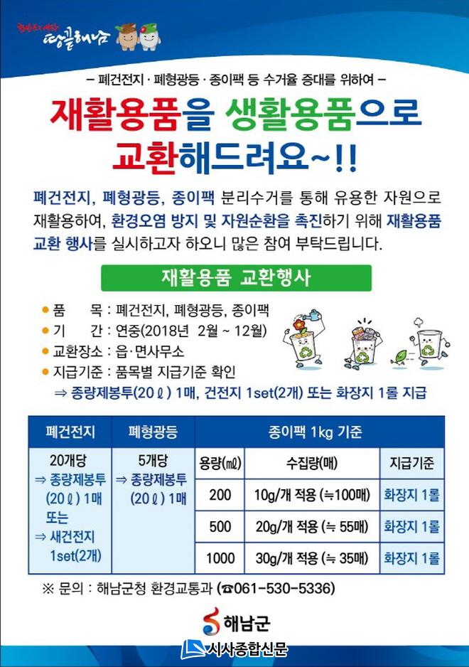 ¿ÃÇØ óÀ½À¸·Î µµÀԵǴ ÀÚ¿øÀçȰ¿ë Ȱ¼ºÈ »ç¾÷Àº ÆóÀÚ¿øÀ» °¡±î¿î À¾¸é»ç¹«¼Ò·Î °¡Á®°¡¸é »ýȰ¿ëǰÀ¸·Î ±³È¯ÇØ ÁÖ°Ô µÈ´Ù. Æó°ÇÀüÁö´Â 20°³´ç Á¾·®Á¦ºÀÅõ(20L) 1¸Å ¶Ç´Â »õ °ÇÀüÁö 2°³, ÆóÇü±¤µîÀº 5°³´ç Á¾·®Á¦ºÀÅõ(20L) 1¸Å, Á¾ÀÌÆÑÀº 1kg´ç ÈÀåÁö 1·Ñ°ú ¹Ù²Ü ¼ö ÀÖ´Ù.