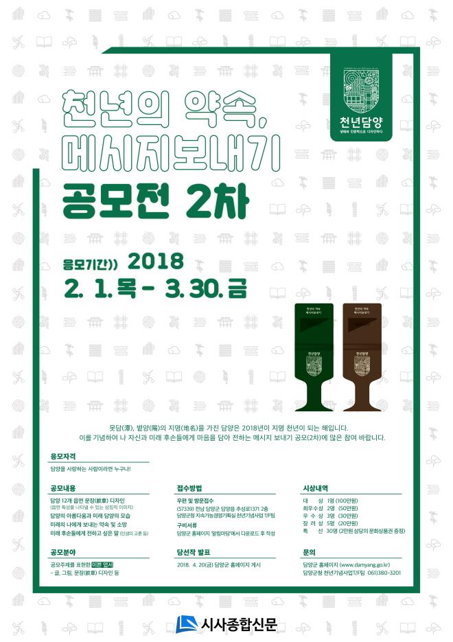 [´ã¾ç/½Ã»çÁ¾ÇսŹ®]¿À½ÂÅà ±âÀÚ = ´ã¾ç±ºÀº ¡®2018 ´ã¾çÁö¸í õ³â¡¯À» ¸Â¾Æ ¹Ì·¡ÀÇ ÀڽŰú Èļյ鿡°Ô õ³âÀÇ À¯»êÀ¸·Î ¹°·ÁÁÖ°íÇ ¸¶À½À» ´ãÀº ¡¸Ãµ³âÀÇ ¾à¼Ó, ¸Þ½ÃÁö º¸³»±â¡¹ 2Â÷ °ø¸ðÀüÀ» ¿À´Â 3¿ù 30ÀϱîÁö ¾à 60Àϰ£ ÁøÇàÇÒ ¿¹Á¤ÀÌ´Ù.