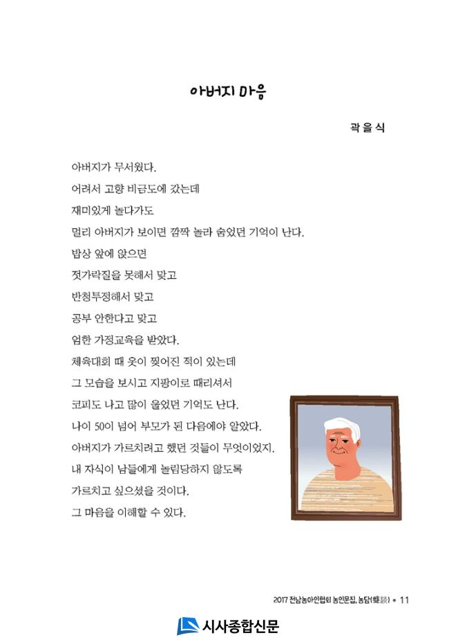 À̹ø¿¡ â°£ÇÑ ¡®³ó´ã(ÖìÓÈ)¡¯Àº ³óÀÎ(û°¢Àå¾ÖÀÎ)µéÀÇ À̾߱â¶ó´Â Àǹ̷ΠÀü¶ó³²µµ ³» ³ó¾ÆÀεéÀÇ ½Ã, »ê¹®, Æò·Ð µî ´Ù¾çÇÑ ¹®ÇÐÀÛǰÀÌ ´ã°ÜÀÖ´Ù. ±è´ëÈ£ ÀÛ°¡¿Í À̼Áø(±¹¾î±¹¹®Çаú 3) ÇлýÀÌ ³ó¾ÆÀεéÀÇ ¼Õ°ú ±Í°¡ µÇ¾î ±×µéÀÇ ¹®ÇÐÀû °¨¼ö¼ºÀ» ´ã¾Æ³Â´Ù.