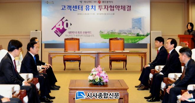 ±¤ÁÖ±¤¿ª½Ã¿Í ÇϳªÄ«µå¢ß´Â 20ÀÏ ¿ÀÀü ½Ãû 3Ãþ ºñÁî´Ï½º·ë¿¡¼ À±ÀåÇö ±¤ÁÖ½ÃÀåÀ» ºñ·Ô, Á¤¼öÁø ÇϳªÄ«µå¢ß ´ëÇ¥ µî ¾çÃø °ü°èÀÚµéÀÌ Âü¼®ÇÑ °¡¿îµ¥ °í°´¼¾ÅÍ À¯Ä¡ ÅõÀÚÇù¾àÀ» ü°áÇß´Ù.