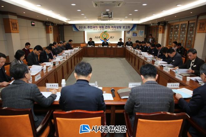 [³ªÁÖ/½Ã»çÁ¾ÇսŹ®]À¯µ¿±¹ ±âÀÚ = ³ªÁÖ½Ã(½ÃÀå °ÀαÔ)°¡ 2018³â À¾.¸é.µ¿ ÁֹΰúÀÇ ´ëÈÀÚ¸®¿¡¼ ³ª¿Â ½Ã¹Î °ÇÀÇ»çÇ× ÃÑ 380°Ç¿¡ ´ëÇÑ ¡®ÃßÁø»óȲ ÃÖÃʺ¸°íȸ¡¯¸¦ ´ã´ç ºÎ¼Àå µî 27¸íÀÌ Âü¼®ÇÑ °¡¿îµ¥ 28ÀÏ Ã»»ç ÀÌȽǿ¡¼ °³ÃÖÇß´Ù.