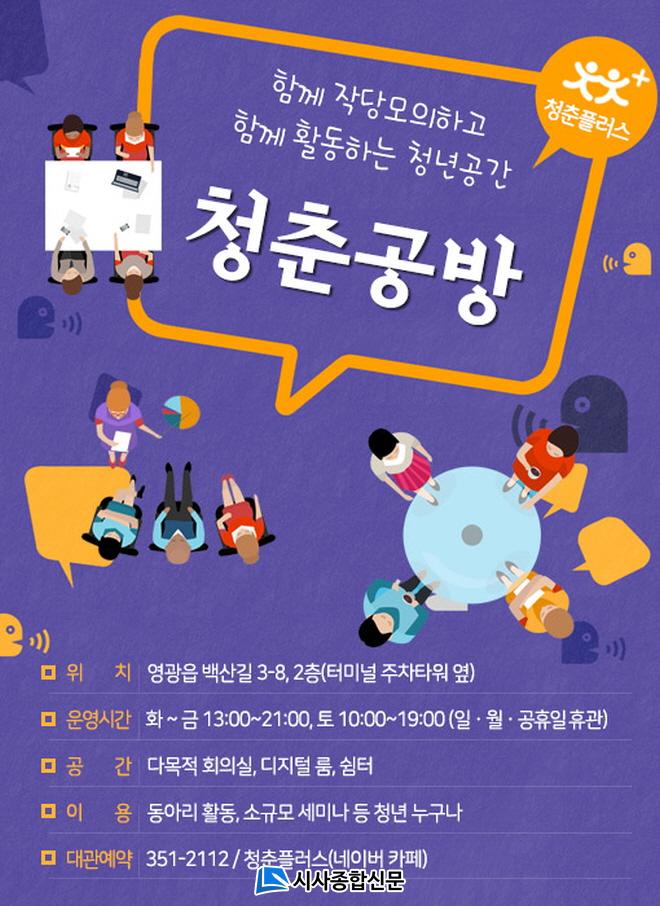 ¿î¿µ½Ã°£Àº È~Åä¿äÀÏ(È~±Ý ¿ÀÈÄ1½Ã ~ 9½Ã/Åä 10½Ã ~ 19½Ã)±îÁö ¿î¿µµÇ¸ç ÀÏ.¿ù.°øÈÞÀÏÀº ÈÞ°üÇÑ´Ù. °ø°£ »ç¿ë¿¡ ´ëÇÑ ´ë°ü ¿¹¾àÀº ûÃá°ø¹æ(¢Ï351-2112)À̳ª ûÃáÇ÷¯½º(³×À̹ö Ä«Æä)¸¦ ÅëÇØ °¡´ÉÇÏ´Ù. ûÃá°ø¹æÀ̶õ ¸íĪÀº °ø¸ð¸¦ ÅëÇØ Á¢¼öµÈ 42°Ç ½É»ç°úÁ¤¿¡ û³âµéÀÇ ÀǰßÀ» ¹Ý¿µÇÏ¿© ¼±Á¤ÇÏ¿´´Ù. ûÃá°ø¹æÀÇ Àǹ̴ âÁ÷, â¾÷ µî âÀÇÀûÀΠȰµ¿À» µµ¸ðÇÒ ¼ö ÀÖ´Â °ø°£À̶ó´Â Àǹ̸¦ ´ã°í ÀÖ´Ù.