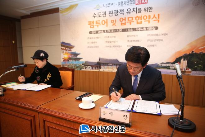 Çù¾à½Ä¿¡ Âü¼®ÇÑ °ÀÎ±Ô ³ªÁÖ½ÃÀåÀº Àλ縻À» ÅëÇØ, ¡°À̹ø Çù¾àÀº Àü¶óµµ Á¤¸í õ ³âÀ» ¸ÂÀÌÇÑ ³ªÁÖÀÇ ¸í¼º°ú Áö¿ªÀÇ ÈÆÈÆÇÑ ÀνÉÀ» Àü±¹¿¡ ¾Ë¸®°í ¼öµµ±Ç °ü±¤°´À» Àû±Ø À¯Ä¡ÇÏ´Â °è±â·Î »ï°Ú´Ù¡±¸ç, ¡°»óÈ£½Å·Ú¿Í ¿ìÀǸ¦ ¹ÙÅÁÀ¸·Î ¿©Çà»óǰ °³¹ß°ú ³ªÁֽà °ü±¤ »ê¾÷ ¹ßÀü¿¡ Å« µµ¿òÀÌ µÇÁÖ½Ã±æ ¹Ù¶õ´Ù¡±°í ¸»Çß´Ù.