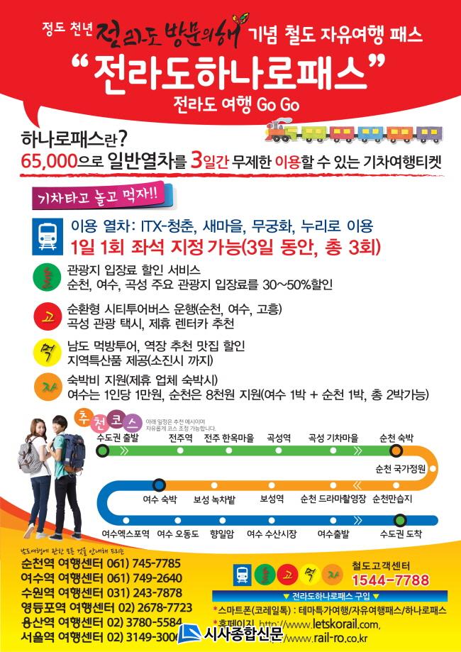 ÀÌ ±â°£ µ¿¾È Àü¶óµµ¸¦ ã¾Æ õ³âÀÇ ¼¼¿ùÀ» ´ãÀº ¿ª»ç¿Í ¹®È¸¦ üÇèÇϸé Àü¶óµµ°¡ Áö¿øÇÏ´Â ±â³äǰ°ú ÄÚ·¹ÀÏ Àü³²º»ºÎ°¡ Á¦°øÇÏ´Â ´Ù¾çÇÑ ÇÒÀÎ ÇýÅõéÀ» Á¦°ø¹ÞÀ» ¼ö ÀÖ´Ù. Àü¶óµµÇϳª·Î ÆÐ½º´Â 1Àδç 65,000¿øÀ¸·Î ¸¸18¼¼ ÀÌ»óÀÌ¸é ´©±¸³ª À̿밡´ÉÇϸç ÄÚ·¹ÀÏ È¨ÆäÀÌÁö(www.letskorail.com)¿Í ½º¸¶Æ®Æù(ÄÚ·¹ÀÏÅå)À¸·Î ±¸¸ÅÇÒ ¼ö ÀÖ´Ù.