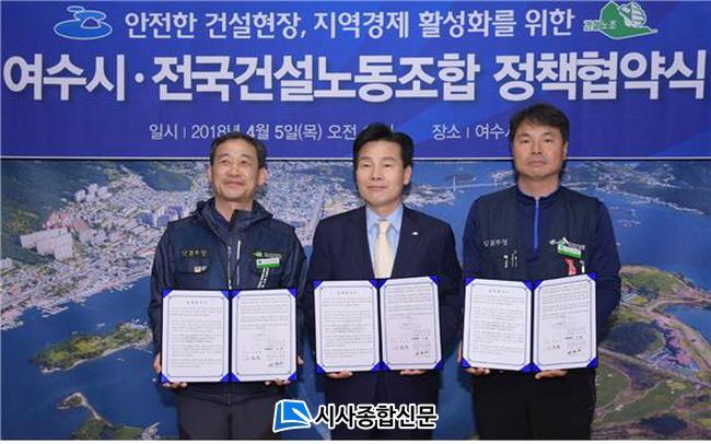 ¿©¼ö½Ã¿Í ³ëµ¿Á¶ÇÕ¿¡ µû¸£¸é 5ÀÏ ¿ÀÀü 10½Ã ÁÖöÇö ¿©¼ö½ÃÀåÀº Áý¹«½Ç¿¡¼ ±¤ÁÖÀü³²°Ç¼³ÁöºÎ ³²»ó¹è ÁöºÎÀå, ±¤ÁÖÀü³²°Ç¼³±â°èÁöºÎ Á¤¾ç¿Á ÁöºÎÀå°ú ±Ù·ÎÀÚ ±Ç¸®º¸È£¿Í ¾ÈÀüÇÑ °Ç¼³ÇöÀå, °í¿ë¾ÈÁ¤, Áö¿ª°æÁ¦ Ȱ¼ºÈ¸¦ À§ÇÑ Á¤Ã¥Çù¾àÀ» ü°áÇß´Ù.