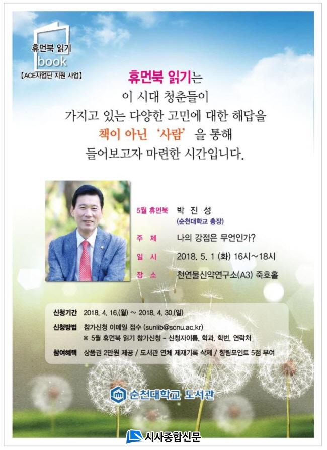 ¼øÃµ´ë µµ¼°üÀÇ ¡®ÈÞ¸ÕºÏ Àб⡯´Â ÀçÇлýµé°ú °ø°¨ÇÏ°í ¼ÒÅëÇÏ´Â ´ëÇй®È Á¤ÂøÀ» À§ÇØ 2017³âºÎÅÍ ¿¬2ȸ ¿î¿µÇؿ ÇÁ·Î±×·¥ÀÌ´Ù. ±×µ¿¾È öÇаú ±èö½Å ±³¼ö¿Í ȯ°æ±³À°°ú ¾È»ï¿µ ±³¼ö°¡ ÈÞ¸ÕºÏÀ¸·Î ³ª¼ °¢°¢ ¡®»îÀÇ ÈçÀû ´õµë±â- ÀüȯÀÇ °è±â¸¦ ã¾Æ¼¡¯, ¡®¿ì¿¬°ú ÇÊ¿¬ »çÀÌ¡¯¶ó´Â Á¦¸ñÀ¸·Î Çлýµé°ú ¼ÒÅëÇÏ´Â ½Ã°£À» °¡Á³´Ù.