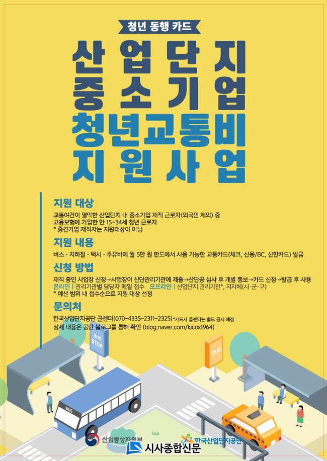 û³âµ¿ÇàÄ«µå´Â ±³Åë¿©°ÇÀÌ ¿¾ÇÇÑ »ê¾÷´ÜÁö¿¡ ÀÖ´Â Áß¼Ò±â¾÷ û³â ±Ù·ÎÀÚ(¸¸ 15~34¼¼)¿¡°Ô 7¿ù 1ÀϺÎÅÍ 2021³â±îÁö ¸Å¿ù 5¸¸¿øÀÇ ±³Åëºñ¸¦ Áö¿øÇÏ´Â »ç¾÷ÀÌ´Ù ÀÍ»ê½Ã »ê¾÷´ÜÁö·Î´Â Á¦3ÀϹݻê¾÷´ÜÁö, Á¦4ÀϹݻê¾÷´ÜÁö, Ȳµî³ó°ø´ÜÁö, »ï±â³ó°ø´ÜÁö, ³¶»ê³ó°ø´ÜÁö, ¿Õ±Ã³ó°ø´ÜÁö, ±¹°¡½ÄǰŬ·¯½ºÅÍ¿¡ ÀÖ´Â Áß¼Ò±â¾÷ û³â±Ù·ÎÀÚ°¡ ÇØ´çµÈ´Ù.
