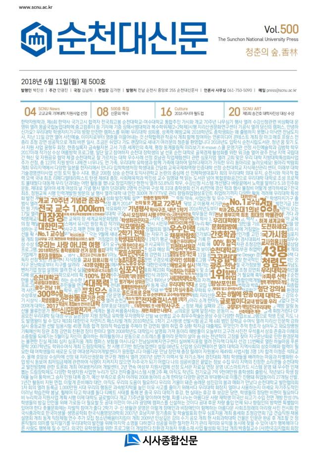 500È£ ±â³ä ¼øÃµ´ë½Å¹®Àº ÃÑ 20¸éÀ¸·Î ±¸¼ºÇØ ±×°£ ¹ßÇàÇÑ ½Å¹®ÀÇ Ç¥Áö À̹ÌÁöºÎÅÍ 500È£ ¹ßÇà Ãà»ç, Ű¿öµå·Î µÇ¤¾îº¸´Â ¼øÃµ´ë½Å¹®, ½Å¹® ¹ßÇà°úÁ¤ µîÀÇ ±âȹ¸éÀ» ºñ·ÔÇØ, ´Ù¾çÇÑ Çг» ¼Ò½Ä°ú ¹®È¿¹¼ú, Ä®·³ µî ´Ùä·Î¿î À̾߱⸦ ´ã¾Ò´Ù.