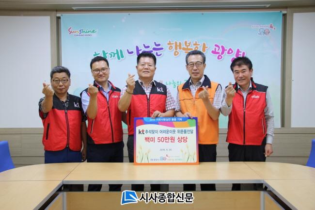 [±¤¾ç/½Ã»çÁ¾ÇսŹ®]Àå¹Î±Ô ±âÀÚ = KT±¤¾çÁöÁ¡(ÁöÁ¡Àå À±ÇüÁØ)Àº Áö³ 2018³â 9¿ù 20ÀÏ (¸ñ) 11:00 (Àç)±¤¾ç½Ã»ç¶û³ª´®º¹ÁöÀç´Ü(ÀÌ»çÀå ¼°æ¼®) ȸÀǽǿ¡¼ ÀÌ¿ô»ç¶û ½ÇõÀ¸·Î ¹°Ç°À» Àü´ÞÇÏ¿´´Ù.