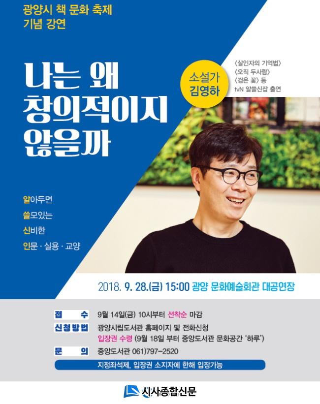 ¸ÕÀú, ÃàÁ¦¿¡ ¾Õ¼ ¿À´Â 9¿ù 28ÀÏ ¿ÀÈÄ 3½Ã ¹®È¿¹¼úȸ°ü ´ë°ø¿¬Àå¿¡¼ ¡®»ìÀÎÀÚÀÇ ±â¾ï¹ý¡¯,¡®°ËÀº ²É¡¯µîÀÇ ¼Ò¼³·Î Àß ¾Ë·ÁÁø ±è¿µÇÏ ÀÛ°¡¸¦ ÃÊÃ»ÇØ ¡®³ª´Â ¿Ö âÀÇÀûÀÌÁö ¾ÊÀ»±î¡¯¶õ ÁÖÁ¦·Î ±â³ä °¿¬ÀÌ ¿¸°´Ù.Çà»ç ´çÀÏÀÎ 10¿ù 3ÀÏ¿¡´Â Èñ¸Áµµ¼°ü¿¡¼ 9½ÃºÎÅÍ ¿ÀÈÄ 3½Ã±îÁö ´©±¸³ª Áñ±æ ¼ö ÀÖ´Â ´Ù¾çÇÑ Ã¥ ¹®È ÃàÁ¦Çà»ç°¡ ÁøÇàµÈ´Ù.