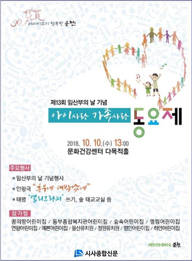 µ¿¿äÁ¦´Â ¹®È°Ç°¼¾ÅÍ ´Ù¸ñÀûȦ¿¡¼ 1½ÃºÎÅÍ ÁøÇàÇÏ°Ô µÇ¸ç, ÀÎÇü±Ø¡®ÈïºÎ³× ´ë¹Ú³µ³×¡¯, ÀÓ»êºÎ¸¦ À§ÇÑ¡®Å¸í ͏®±×¶óÇÇ ¾²±â¡¯, ÀÓ»êºÎüÇè µî ´Ù¾çÇÏ°Ô ÁøÇàµÇ¸ç, µ¿¿äÁ¦ °æ¿¬¸ð½ÀÀº ¼øÃµ½Ã ÆäÀ̽ººÏ(www.facebook.com /suncheon.kr)À¸·Î »ýÁß°è µÈ´Ù.
