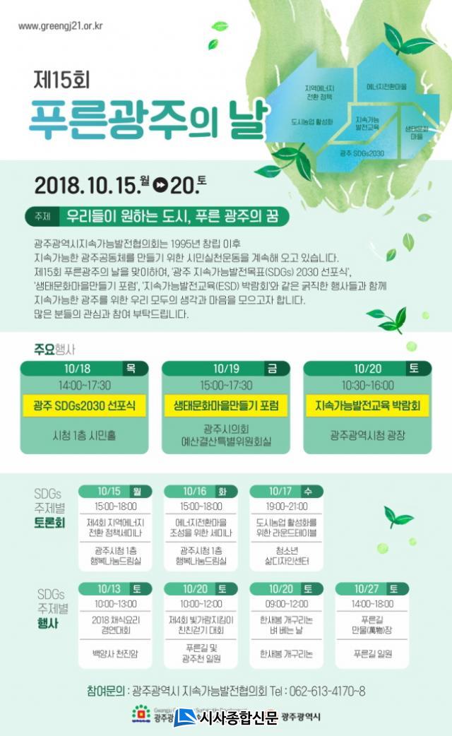 ¿ÃÇØ ¸ÞÀÎÇà»ç·Î´Â 18ÀÏ ¿ÀÈÄ 2½Ã ½Ãû 1Ãþ ½Ã¹ÎȦ¿¡¼ ¡®±¤ÁÖ SDGs 2030 ¸ñÇ¥¡¤ÁöÇ¥ ¼±Æ÷½Ä¡¯À» ºñ·ÔÇØ ¡ã»ýŹ®È¸¶À»¸¸µé±â 10Áֳ⠱â³ä Æ÷·³¡¤ÅäÅ©ÄܼƮ(19ÀÏ ¿ÀÈÄ 3½Ã ½ÃÀÇȸ 5Ãþ ȸÀǽÇ) ¡ãÁö¼Ó°¡´É¹ßÀü±³À°(ESD) ¹Ú¶÷ȸ(20ÀÏ ¿ÀÀü 10½Ã30ºÐ ½Ãû ¾ß¿ÜÀ½¾Ç´ç) µîÀÌ ¸¶·ÃµÆ´Ù.