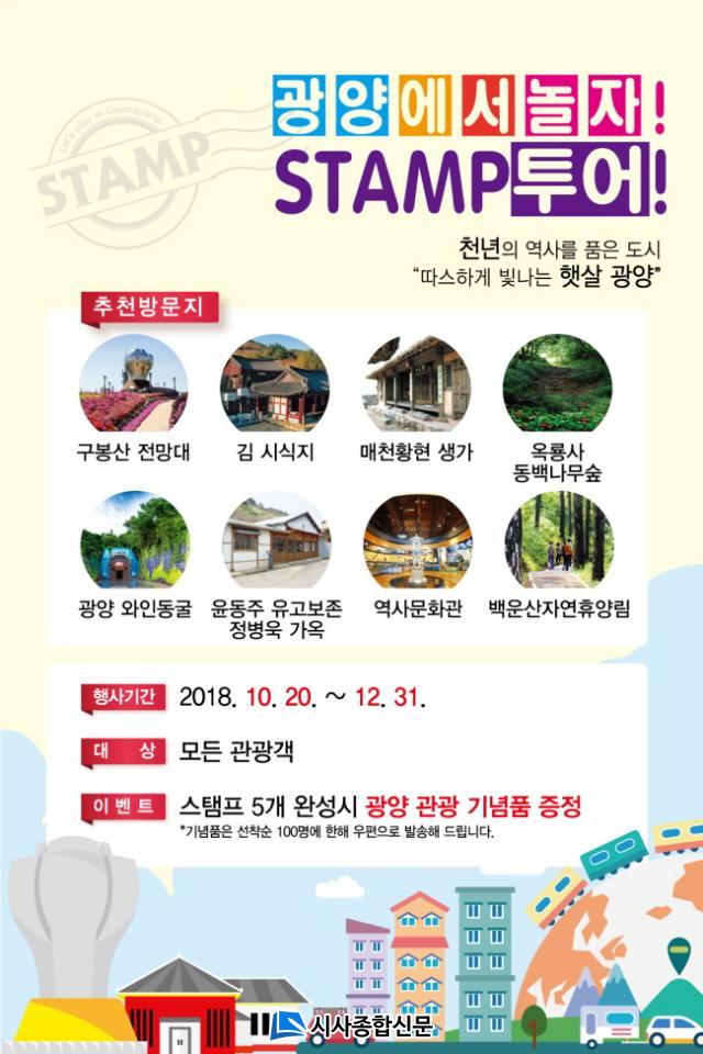 Ãßõ¹æ¹®Áö´Â À̼ø½Å´ë±³¿Í ±¤¾ç¸¸À» ÇÑ´«¿¡ Á¶¸ÁÇÒ ¼ö ÀÖ´Â ±¸ºÀ»êÀü¸Á´ë¸¦ ºñ·ÔÇØ ±è ½Ã½ÄÁö, ¸ÅõȲÇö»ý°¡, ¿Á·æ»çÁö, ±¤¾ç¿ÍÀε¿±¼, À±µ¿ÁÖ À¯°í°¡ º¸Á¸µÈ Á¤º´¿í°¡¿Á, ±¤¾ç¿ª»ç¹®È°ü, ¹é¿î»êÀÚ¿¬È޾縲 µîÀ¸·Î ±¸¼ºµÆ´Ù.Âü¿©¹æ¹ýÀº Ãßõ¹æ¹®Áö 8°³¼Ò Áß 5°³¼Ò ÀÌ»óÀ» ¹æ¹®ÇØ °ü±¤Áöº° Ư¡À» À̹ÌÁöÈ ÇÑ ½ºÅÆÇÁ¸¦ ¿±¼·Î ¿Ï¼ºÇÑ ´ÙÀ½ ½Ã °ü±¤°ú·Î º¸³»¸é µÈ´Ù.±¤¾ç½Ã¿¡¼´Â ¼±Âø¼øÀ¸·Î ½ºÅÆÇÁ ¿±¼ ¿Ï¼ºÀÚ 100¸í¿¡°Ô ¸Å½Ç¼Ò±Ý, ¶óº¥´õºñ´© µî °ü±¤±â³äǰÀ» ¿ìÆíÀ¸·Î ¹è¼ÛÇÒ °èȹÀÌ´Ù.