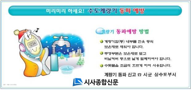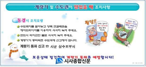 Ãß¿î °Ü¿ïö¿¡ Àå½Ã°£ ¿ÜÃâÇϰųª ÇÑÆÄ¿¹º¸°¡ Áö¼ÓµÉ ¶§¿¡´Â ¼öµ¾¹°À» ¾àÇÏ°Ô Æ²¾î ¹°ÀÌ °è¼Ó È帣°Ô ÇÏ°í ¿À·¡µÈ ¾ÆÆÄÆ®³ª ´Üµ¶ÁÖÅÃÀº ¼öµµ°è·®±âÇÔ ³»ºÎ¸¦ º¸¿ÂÆÑÀ̳ª Çå¿ÊÀ¸·Î ä¿ö¾ß ÇÑ´Ù. ¶Ç ¸¶´ç°ú °Ç¹° ¿Üº® µî¿¡ ¼³Ä¡µÈ ¼öµµ°üÀº º¸¿ÂÀç·Î °¨½Î¾ß ÇÑ´Ù.