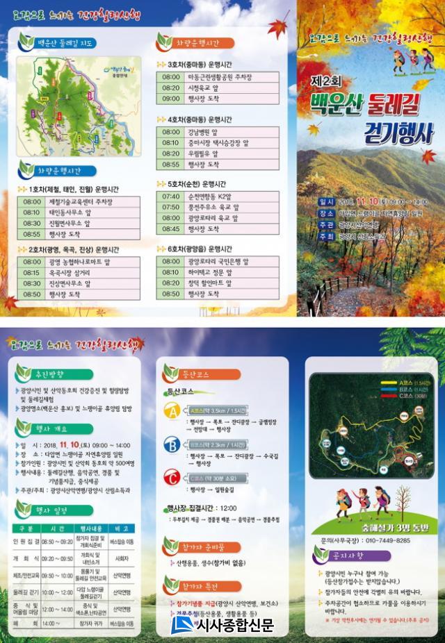 ±¤¾ç½Ã»ê¾Ç¿¬¸Í¿¡¼ ÁÖ°üÇÏ°í ±¤¾ç½Ã°¡ ÁÖÃÖÇÏ´Â À̹ø Çà»ç´Â ½Ã¹ÎµéÀÇ °Ç°ÁõÁø°ú ±¤¾çÀÇ ¸í»êÀÎ ¹é¿î»êÀ» ¾Ë¸®±â À§ÇØ ¸¶·ÃµÆÀ¸¸ç, Çà»ç´Â ¿ÀÀü 9½Ã 20ºÐ °³È¸½ÄÀ» ½ÃÀÛÀ¸·Î ¾ÈÀüÇÑ µî¹ÝÀ» À§ÇÑ ÁغñüÁ¶¿Í ¾ÈÀü±³À°À» °ÅÃÄ 10½ÃºÎÅÍ µÑ·¹±æ °È±â°¡ ½ÃÀ۵ȴÙ.