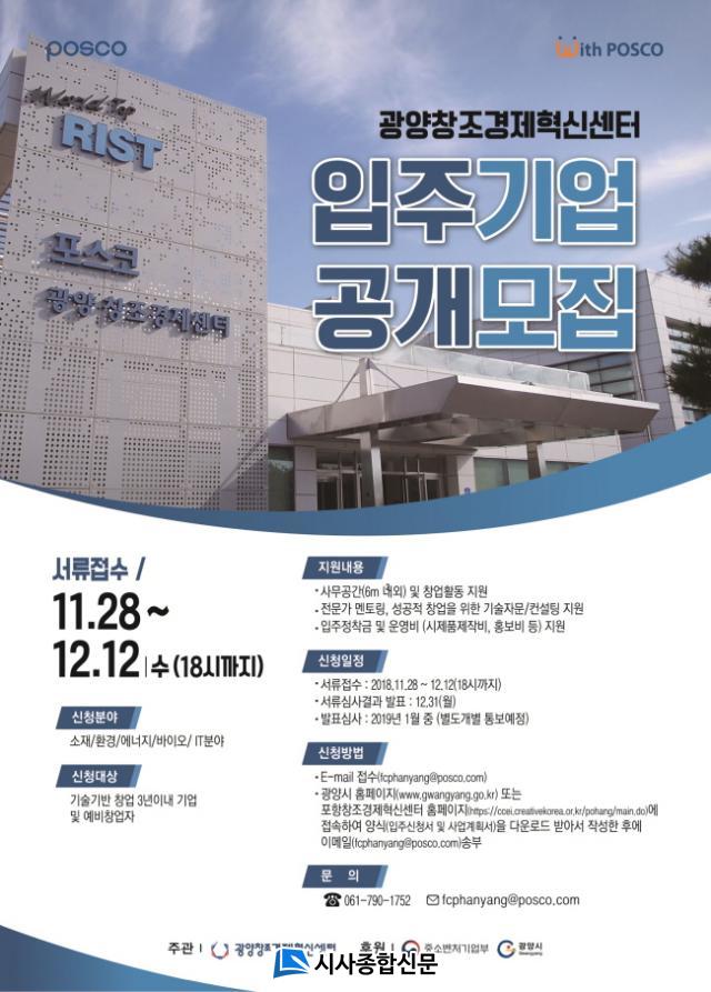 ÇÑÆí, ±¤¾çâÁ¶°æÁ¦Çõ½Å¼¾ÅÍ¿¡ ÀÔÁÖ¸¦ Èñ¸ÁÇÏ´Â ±â¾÷ ¹× ¿¹ºñâ¾÷ÀÚ´Â °ü·Ã ¼·ù(ÀÔÁÖ ½Åû¼, »ç¾÷ °èȹ¼ µî)¸¦ ±¸ºñÇØ ¿À´Â 12¿ù 12ÀÏ 18½Ã±îÁö e-mail(fcphanyang@posco.com)·Î Á¢¼öÇÏ¸é µÈ´Ù.