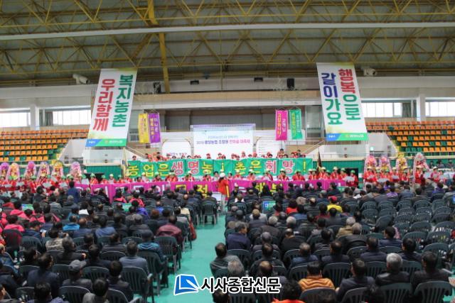 À̹ø Çà»ç´Â Àü±¹ ÃÖ°í ³óÇù Á¶ÇÕ¿øÀ¸·Î¼ ÁÖÀÎÀǽÄÀ» °®°Ô Çϰí FTA µî À¸·Î ¾î·Á¿î ³ó¾÷ÀÎ(Á¶ÇÕ¿ø)¿¡°Ô ¿ôÀ½°ú Èñ¸ÁÀ» ÁÖ¸ç, ¾ÈÀüÇÑ ¿ì¸®³ó»ê¹° »ý»êÀڷμÀÇ ±àÁö¿Í ÀںνÉÀ» °®°ÔÇÔÀº ¹°·Ð Áö¿ª»çȸ¿Í ÇÔ²²ÇÏ´Â ³óÇùÀ¸·Î Á¶ÇÕ¿øÀÇ ÈÇÕÀ» À¯µµÇϰíÀÚÇÕÀ¸·Î, ¸¶À» ¿µ³óȸ ¹× ºÎ³àȸ, ³ó¾÷ÀÎ, ³»ºó µî Á¶ÇÕ¿ø Æ÷ÇÔ 2,500¿©¸íÀÌ Âü¼® ¼ºÈ²¸®¿¡ ÁøÇàµÇ¾ú´Ù.