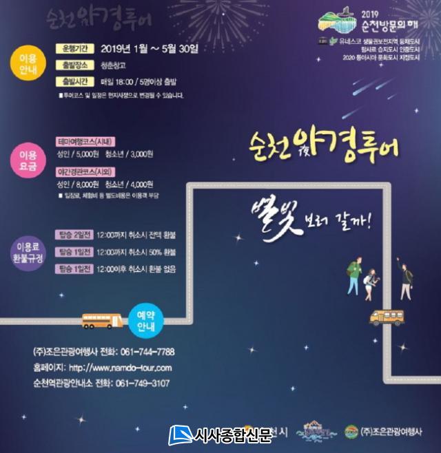 ¼øÃµ½Ã¿¡¼ Ãâ¹ßÇÑ ¾ß°æÅõ¾î¹ö½º´Â ¼øÃµ.¿©¼ö.±¤¾ç ¹ãdz°æÀÇ ¸Å·ÂÀ» ¼Ò°³ÇÑ´Ù. Åõ¾î´Â ¼øÃµÀÇ µå¶ó¸¶ÃÔ¿µÀå ¾ß°æ.È£·¯Ã¼Çè, ¿Í¿ÂÇØº¯ ºÒ²É³îÀÌ, ±¤¾çÀÇ ´À·©À̰ñ, À̼ø½Å´ë±³, ¿©¼öÀÇ µ¹»ê°ø¿ø, Á¾Æ÷ÇØ¾ç°ø¿ø µî ÁÖ¿ä°ü±¤Áö¸¦ °æÀ¯ÇØ ¼øÃµÀ¸·Î µ¹¾Æ¿À´Â ¾à 3½Ã°£ 30ºÐÀÌ ¼Ò¿äµÇ´Â ¾ß°£ÄÚ½º·Î ±¸¼ºµÇ¾ú´Ù.