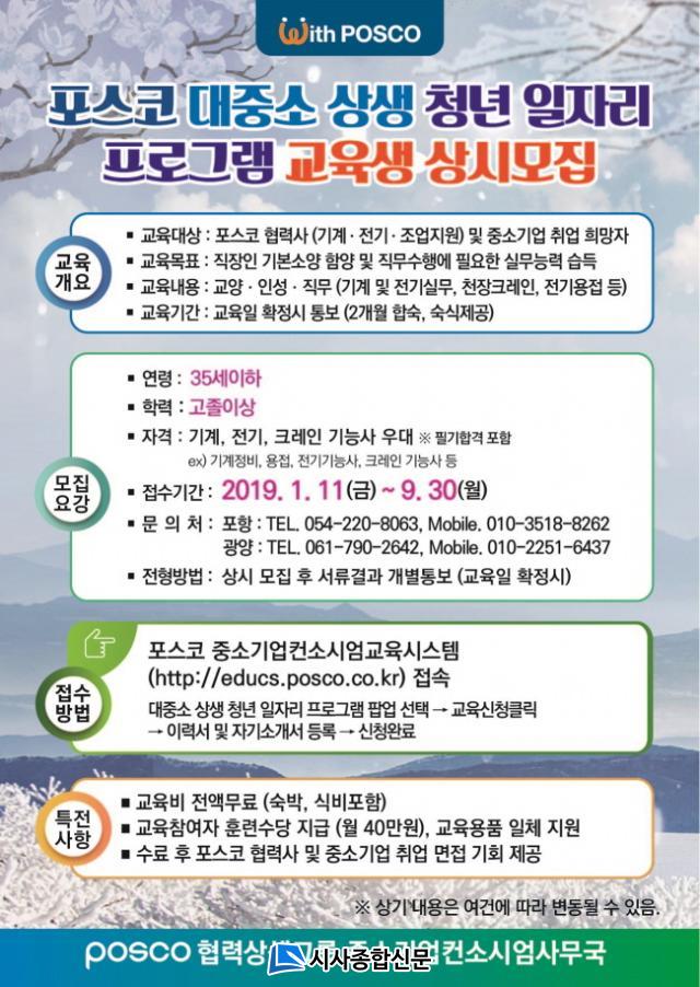 ÇÑÆí, Æ÷½ºÄÚ ±¤¾çÁ¦Ã¶¼ÒÀÇ ¡®Çù·Â»ç Ãë¾÷Èñ¸ÁÀÚ ±³À°¡¯Àº 2017³â »ó¹Ý±âºÎÅÍ ¿ÃÇØ ÃʱîÁö ÃÑ 5Â÷¼ö¿¡ °ÉÃÄ 85¸íÀÇ ±¤¾çÁ¦Ã¶¼Ò Çù·Â»ç Ãë¾÷À» µµ¿Ô´Ù. ÀÚ¼¼ÇÑ ³»¿ëÀº Æ÷½ºÄÚ Áß¼Ò±â¾÷ ÄÁ¼Ò½Ã¾ö»ç¹«±¹(061-790-2642)À¸·Î ¹®ÀÇÇÏ¸é µÈ´Ù.