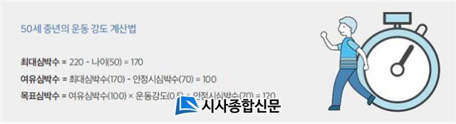 Æò¼Ò °¡¸¸È÷ ¾É¾Æ¼ ÃøÁ¤ÇÑ ¾ÈÁ¤ ½Ã ½ÉÀå¹Úµ¿¼ö°¡ 70ȸÀÎ 50¼¼ÀÇ ¼ºÀÎÀ̶ó¸é ¿©À¯ ½É¹Ú¼ö´Â 100ȸÀÌ´Ù.¿¹¸¦ µé¾î 50%ÀÇ ¿îµ¿ °µµ¸¦ À§Çؼ´Â ¿îµ¿ Áß ½É¹Ú¼ö 120ȸ Á¤µµ¸¦ À¯ÁöÇÏ¸é µÈ´Ù. ¾ÈÀüÀ» À§Çؼ ¿îµ¿ °µµ¸¦ 40%¿¡¼ ½ÃÀÛÇØ¼ 80%±îÁö ¼¼È÷ ¿Ã¸®´Â °ÍÀÌ ÁÁ´Ù. ¿äÁòÀº °ÉÀ½¼ö »Ó ¾Æ´Ï¶ó ½É¹Ú¼ö¸¦ ÃøÁ¤ÇØÁÖ´Â µðÁöÅÐ ¹êµå³ª ½Ã°è µîÀ» ½±°Ô ±¸ÇÒ ¼ö ÀÖÀ¸¹Ç·Î Àû±Ø Ȱ¿ëÇÏ´Â °ÍÀÌ ÁÁ°Ú´Ù.