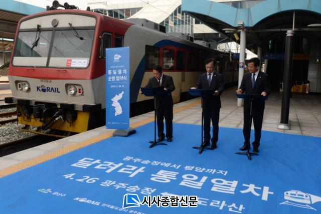 À̳¯ Çù¾à½ÄÀº ±× ù ´ÜÃß·Î, ¼¼ ±â°üÀº 4¡¤27 ³²ºÏÁ¤»óȸ´ã 1ÁÖ³âÀ» ÇÏ·ç ¾ÕµÐ 4¿ù 26ÀÏ ¡®±¤ÁÖ¼ÛÁ¤¿ª~µµ¶ó»ê¿ª ¿Õº¹ ÅëÀÏ¿Â÷ ¿©Ç࡯ ÃßÁøÀ» ¾à¼ÓÇß´Ù.