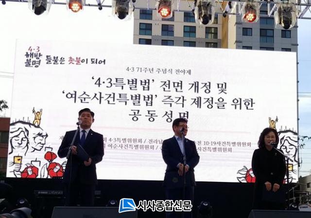 4¿ù 2ÀÏ Àú³á Á¦ÁÖ½Ãû ±¤Àå¿¡¼ ¿¸° Á¦71ÁÖ³â Á¦ÁÖ 4.3Èñ»ýÀÚ Ãß³ä½Ä Àü¾ßÁ¦¿¡¼ Á¦ÁÖÆ¯º°ÀÚÄ¡µµÀÇȸ 4.3Ưº°À§¿øÈ¸, Àü¶ó³²µµÀÇȸ ¿©¼ö¡¤¼øÃµ 10¡¤19»ç°ÇƯº°À§¿øÈ¸, ¿©¼ö½ÃÀÇȸ ¿©¼ø»ç°ÇƯº°À§¿øÈ¸, ¼øÃµ½ÃÀÇȸ ¿©¼ø»ç°ÇƯº°À§¿øÈ¸´Â¡®±¹°¡°ø±Ç·Â¿¡ Èñ»ýµÈ Á¦ÁÖ 4.3 ¹× ¿©¼ø»ç°Ç Èñ»ýÀÚÀÇ ¸í¿¹¸¦ ȸº¹Ç϶ó!¡¯¸ç Ưº°¹ý Á¦Á¤À» Ã˱¸ÇÏ´Â °øµ¿¼º¸íÀ» ¹ßÇ¥Çß´Ù.