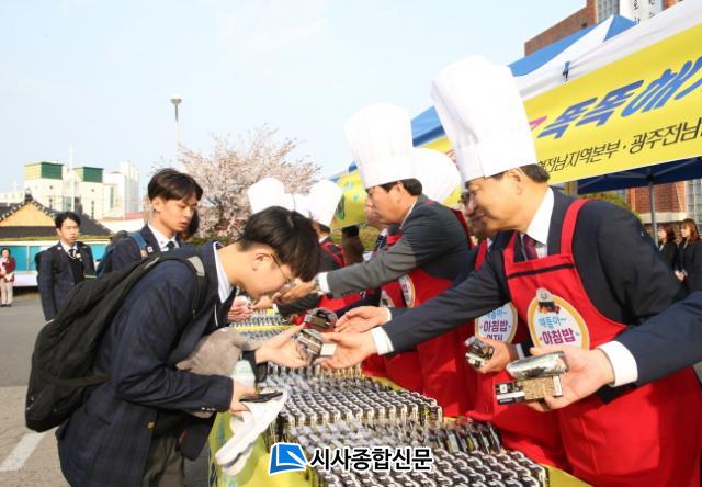 [Àü³²/½Ã»çÁ¾ÇսŹ®]¿À½ÂÅà ±âÀÚ = Àå¼®¿õ Àü¶ó³²µµ±³À°°¨(¸Ç ¿À¸¥ÂÊ)ÀÌ 4¿ù 9ÀÏ(È) ¿ÀÀü ¸ñÆ÷°íµîÇб³ Àá·æ°ü ¾Õ¿¡¼ ³óÇùÀü³²º»ºÎ¿Í ÇÔ²² û¼Ò³â ¾ÆÄ§¹ä¸Ô±â Ä·ÆäÀο¡ Âü¿©ÇØ µî±³ÇÏ´Â Çлýµé¿¡°Ô »ï°¢±è¹ä°ú µÎ·ù¸¦ ³ª´²ÁÖ°í ÀÖ´Ù.