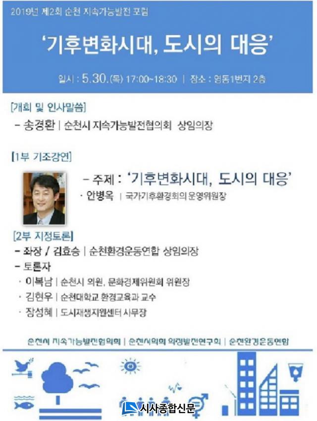 ¼øÃµ½Ã Áö¼Ó°¡´É¹ßÀüÇùÀÇȸ(»óÀÓÀÇÀå ¼Û°æÈ¯)´Â ¿À´Â 5¿ù 30ÀÏ ¿ÀÈÄ 5½Ã ¼øÃµ»ýȰ¹®È¼¾ÅÍ ¿µµ¿1¹øÁö¿¡¼¡®±âÈĺ¯È½Ã´ë, µµ½ÃÀÇ ´ëÀÀ¡¯À» ÁÖÁ¦·Î ¾Èº´¿Á ±¹°¡±âÈÄȯ°æÈ¸ÀÇ ¿î¿µÀ§¿øÀåÀ» ÃÊû, Á¦2ȸ ¼øÃµ Áö¼Ó°¡´É¹ßÀü Æ÷·³À» °³ÃÖÇÑ´Ù.