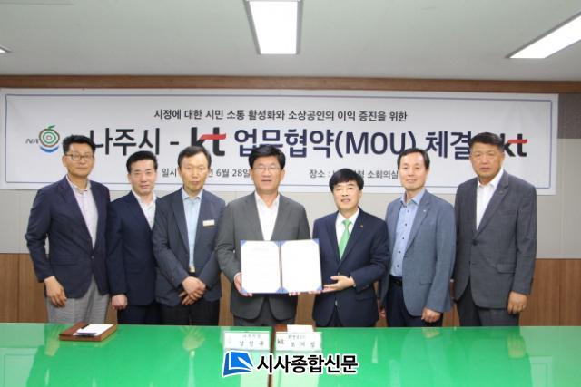 ³ªÁÖ½Ã(½ÃÀå °ÀαÔ)´Â 28ÀÏ ½Ãû ¼ÒȸÀǽǿ¡¼ ¢ßKT¿Í ¾÷¹«Çù¾àÀ» ü°á, ¿Ã·¹TVÇ÷§Æû ä³Î¸ÁÀ» Ȱ¿ëÇÑ ½ÃÁ¤ ¼Ò½Ä ¹æ¿µÀ» ÅëÇØ, ½Ã¹Î°úÀÇ ¼ÒÅë °È¿¡ ³ª¼±´Ù°í ¹àÇû´Ù. À̳¯ Çù¾à½Ä¿¡´Â °ÀÎ±Ô ³ªÁÖ½ÃÀå, ¿À±â¼· KTÀü³²°í°´º»ºÎÀåÀ» ºñ·ÔÇØ ½Ãû ´ã´ç ºÎ¼, KT ÀÓÁ÷¿ø °ü°èÀÚ µî 10¿©¸íÀÌ Âü¼®Çß´Ù.