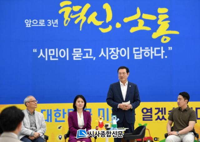 À̿뼷 ½ÃÀåÀº ¡°¹Î¼±7±â 1³âÀÌ Çõ½Å°ú ¼ÒÅëÀ¸·Î ±¤ÁÖÀÇ ±âƲÀ» ´ÙÁø º»¸³µµ»ý(ÜâØ¡Ô³ßæ)ÀÇ ½Ã±â¿´´Ù¸é ¾ÕÀ¸·Î 3³âÀº ´ëÇѹα¹ÀÇ ¹Ì·¡·Î µµ¾àÇÏ´Â °á½ÇÀÇ ½Ã°£ÀÌ µÉ °Í¡±À̶ó¸ç ¡°Çõ½ÅÃßÁøÀ§ÀÇ Çõ½Å¾ÈÀ» ¹Ù·Î¹Ù·Î ½ÃÇàÇØ ½ÃÁ¤À» º¯È½Ã۰í, ½Ã¹Î±ÇÀÍÀ§¿øÈ¸¸¦ Áß½ÉÀ¸·Î ½Ã¹ÎÁß½ÉÀÇ ÇöÀåÇàÁ¤À» À̾ ¼ÒÅëÀ» ÇÑÃþ °ÈÇϸç, ÀÏÀÚ¸®À§¿øÈ¸¸¦ Áß½ÉÀ¸·Î 4Â÷ »ê¾÷Çõ¸í½Ã´ëÀÇ ÀÏÀÚ¸® âÃâ¿¡ ÁÖ·ÂÇϰڴ١±°í ¸»Çß´Ù.