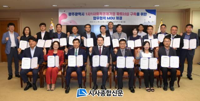±¤Áֽô 5ÀÏ ½Ãû ºñÁî´Ï½º·ë¿¡¼ ±¤ÁÖ½ÃÁö¼Ó°¡´É¹ßÀüÇùÀÇȸ, Áö¿ª±â¾÷ 15°÷, »çȸÀû°æÁ¦±â¾÷ ÇùÀÇȸ 4°÷, »çȸÀû°æÁ¦ Áß°£Áö¿ø±â°ü 2°÷°ú Áö¼Ó°¡´É°æ¿µ »ýŰè Á¶¼º°ú »çȸÀû°æÁ¦ Ȱ¼ºÈ¸¦ À§ÇÑ ¡®1»ç(Þä) 1»çȸÀû°æÁ¦±â¾÷ ÆÄÆ®³Ê½Ê ±¸ÃàÀ» À§ÇÑ ¾÷¹«Çù¾à¡¯À» ü°áÇß´Ù.
