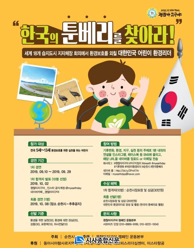 À̹ø ¼øÃµ½Ã¿¡¼ °ø¸ðÇÏ´Â ¡®Çѱ¹ÀÇ Å÷º£¸®¸¦ ã¾Æ¶ó¡¯¿¡¼´Â ¡®±¦Âú¾Æ Áö±¸¾ß¡¯ Ä·ÆäÀÎ ¿îµ¿º»ºÎ¿Í ÇÔ²² °æ¿¬À» ÅëÇØ Àü±¹ÀÇ 5¼¼¿¡¼ 13¼¼±îÁö ȯ°æ »ç¶ûÀ» ½ÇõÇϰí ÀÖ´Â ¾î¸°À̸¦ ¼±¹ßÇÑ´Ù. ¸ðÁý±â°£Àº 9¿ù 10ÀϺÎÅÍ 29ÀϱîÁö·Î 1Â÷·Î 10¸íÀ» ¼±¹ßÇϰí 2Â÷ ÃÖÁ¾ °æ¿¬À» ÅëÇØ ÃÖÁ¾ 1¸íÀ» ¼±¹ßÇÏ°Ô µÈ´Ù.