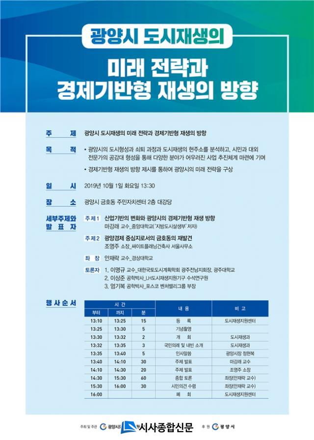 ƯÈ÷, °æÁ¦±â¹ÝÇü Àç»ýÀÇ ¹æÇâ Á¦½Ã¸¦ ÅëÇÏ¿© ±¤¾ç½ÃÀÇ ¹Ì·¡ Àü·«À» ±¸»óÇϰíÀÚ ÇÑ´Ù. À̹ø ½ÉÆ÷Áö¾öÀº ¡®±¤¾ç½Ã µµ½ÃÀç»ýÀÇ ¹Ì·¡Àü·«°ú °æÁ¦±â¹ÝÇü Àç»ýÀÇ ¹æÇ⡯À» ÁÖÁ¦·Î ¿¸®¸ç, °æ»ó´ëÇб³ ¾ÈÀç¶ô ±³¼ö¸¦ ÁÂÀåÀ¸·Î Áß¾Ó´ëÇб³ ¸¶°·¡ ±³¼öÀÇ ¡®»ê¾÷±â¹ÝÀÇ º¯È¿Í ±¤¾ç½ÃÀÇ °æÁ¦±â¹ÝÇü Àç»ý¹æÇ⡯ ±âÁ¶ ¹ßÇ¥¿Í ¡®±¤¾ç°æÁ¦ Áß½ÉÁö·Î¼ÀÇ ±ÝÈ£µ¿ÀÇ Àç¹ß°ß¡¯ ¿¡ ´ëÇÑ ½ÎÀÌÆ®Ç÷¡´×°ÇÃà»ç Á¶¿µÁÖ ¼ÒÀåÀÇ ¹ßÇ¥·Î ÁøÇàµÈ´Ù.