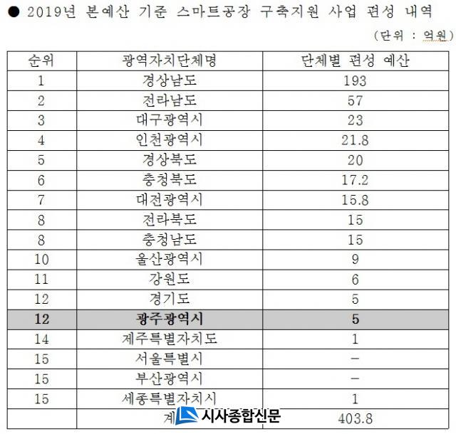 ±èÁ¡±âÀÇ¿øÀº ¡°11´ë ´ëÇ¥»ê¾÷Àº ģȯ°æ ÀÚµ¿Â÷»ê¾÷, ¿¡¾î°¡Àü ¹× °ø±â»ê¾÷, ±¤À¶ÇÕ»ê¾÷, ¿¡³ÊÁö ¹× ¼ö¼Ò»ê¾÷, ÀÇ·á ¹× ÇコÄɾî»ê¾÷, ½º¸¶Æ® »Ñ¸®»ê¾÷, ÀΰøÁö´É ¹× µå·Ð»ê¾÷, 5G±â¹Ý Á¤º¸Åë½Å±â¼ú(ICT) »ê¾÷, ¹®ÈÄÜÅÙÃ÷»ê¾÷, °ü±¤»ê¾÷, ±èÄ¡ ¹× À½½Ä»ê¾÷À¸·Î¼ ½º¸¶Æ® °øÀå ±¸ÃàÀÌ ÀüÁ¦µÇ¾î¾ßÇÑ´Ù¡±°í ÁÖÀåÇÏ¸é¼ ¡°ÀÌ¿¡ ¹ÝÇØ 2019³â º»¿¹»ê ±âÁØ 17°³ ±¤¿ªÀÚÄ¡´Üü ½º¸¶Æ®°øÀå ±¸Ãà Áö¿øÀ» À§ÇÑ ¿¹»êÀº ±¤ÁÖ±¤¿ª½ÃÀÇ °æ¿ì 5¾ï¿øÀ¸·Î Àüü ±¤¿ªÀÚÄ¡´Üü 403¾ï¿øÀÇ 1.2%¿¡ ºÒ°úÇÏ´Ù¡±°í ÁúŸÇß´Ù.