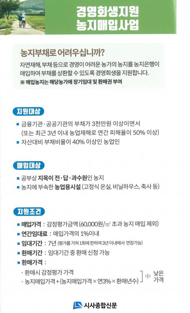 Áö³ 2006³â¿¡ ½ÃÀÛµÈ °æ¿µÈ¸»ýÁö¿ø»ç¾÷Àº ÀÚ¿¬ÀçÇØ, ºÎäÀÇ Áõ°¡ µîÀ¸·Î ¾î·Á¿ò¿¡ óÇÑ ³ó¾÷ÀÎÀÇ ³óÁö µîÀ» ³óÁöÀºÇàÀÌ ¸ÅÀÔÇϰí, ¸Å°¢´ë±ÝÀ¸·Î ºÎ並 »óȯÇϵµ·Ï Áö¿øÇÏ´Â Á¦µµÀÌ´Ù.
