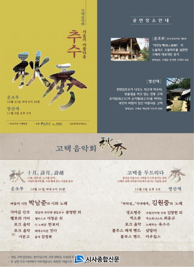 ƯÈ÷, ÀÌ ³¯Àº ¹öµéÄ¡ ½ÃÀÎÀ¸·Î À¯¸íÇÑ ¹Ú³²ÁØ ½ÃÀΰú °¡¾ß±Ý »êÁ¶ ¿¬ÁÖÀÚÀÎ ¼Û¿µ¶õ ±³¼ö, ÿ¸®½ºÆ® ÀÌÁ¤¼ø, ½Ã ³ë·¡²Û ÇѺ¸¸®¿Í ·¹°Ô¼Ò¸®²Û Áþ´Ù µîÀÌ Ãâ¿¬ÇØ °¡À»¹ãÀ» dz¼ºÇÏ°Ô Ã¤¿ï ¿¹Á¤ÀÌ´Ù. 11¿ù 3ÀÏ ÀÏ¿äÀÏ¿¡´Â Àü¶ó³²µµ ¹Î°£Á¤¿øÀÌÀÚ ºñ¹ÐÁ¤¿øÀ¸·Îµµ À¯¸íÇÑ ½Ö»êÀç¿¡¼ ¿ÀÈÄ 2½Ã¿¡ ¡®°íÅÃÀ» µÎµå¸®´Ù¡¯¸¦ ÁÖÁ¦·Î µÎ¹øÂ° À½¾Çȸ°¡ ¿¸°´Ù.